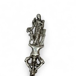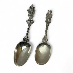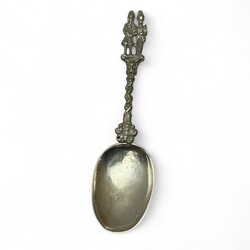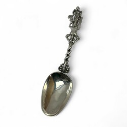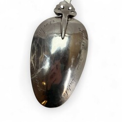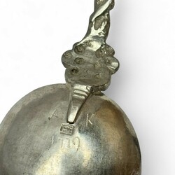 | Omschrijving | Een antieke 19e eeuwse tweede gehalte (835/1000) zilveren geboortelepel met getoste steel, bekroond met de Republiek. Met inscriptie ‘Feikje Anes Andela geboren den 27 juny 1872’ (Hitzum). Met jaarletter N (1872) en onduidelijk meesterteken, eindigend op ‘60’. Met daarbij een lepel, bekroond met vorstelijk paar, onduidelijk gemerkt, gegraveerd ‘AK 1719’. |