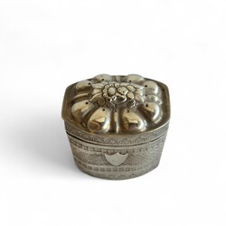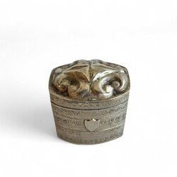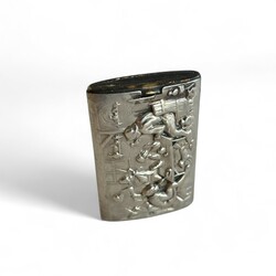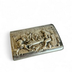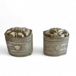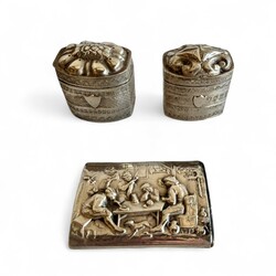 | Omschrijving | Lot van twee antieke 19e eeuwse tweede gehalte (835/1000) zilveren lodereindoosjes, met daarbij een 20e eeuws tweede gehalte (835/1000) zilveren luciferdoosje met herbergdecor. |