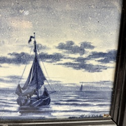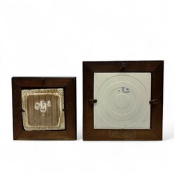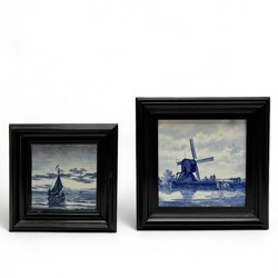 | Omschrijving | Lot van twee antieke blauw-witte tegels, één met voorstelling van een schip, naar Mesdag, en één met een voorstelling van twee koeien en een molen, naar Roelofs. Beide gemerkt Porceleyne Fles, . Beide met schildersmonogram HB = Hendrik Christiaan Bottelier, de grootste met jaarletter D (1888), de kleine jaarletter G (1885). In zwarthouten lijstjes. |