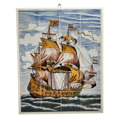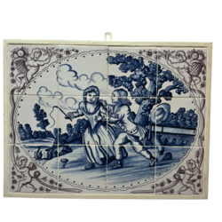 | Omschrijving | Twee tegeltableaus, 12 en 20 tegels. 1 met een voorstelling van een heer en dame in het blauw met putti in de hoeken. De ander met een polychroom Hollandse driemaster op zee. Beide 20e eeuws. |