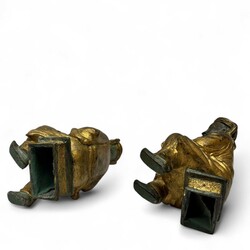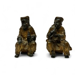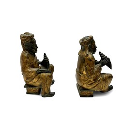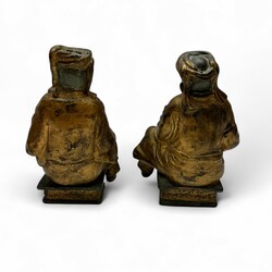 | Omschrijving | Lot van twee 20e eeuwse gedeeltelijk vergulde Thaise bronzen figuren, voorstelling van twee zittende mannen met schelpvormige fluit. |