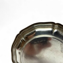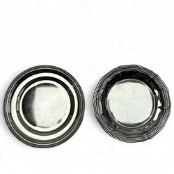 | Omschrijving | Lot van twee zilveren schaaltjes: één met gecontourneerde rand, Engels gekeurd, en één Duits, gemerkt ‘835’, halve maan en kroon. |