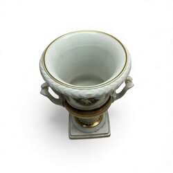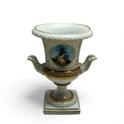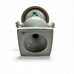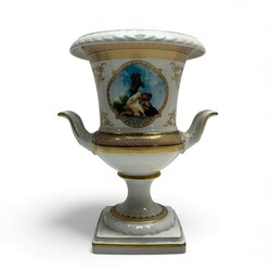 | Omschrijving | Een 20e eeuwse porseleinen vaas. Urnvormig, op vierkante voet. Met vergulde ornamenten, twee gebogen handgrepen en een geprofileerde rand. Met aan de voor- en achterzijde een afbeelding van Sint-Petersburg: de Sint-Isaackathedraal en het Bronzen Ruiter monument. Aan de onderzijde gemerkt Kaiser, Duitsland. |