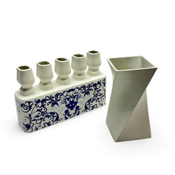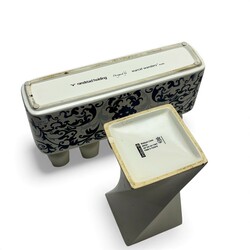 | Omschrijving | Een aardewerken wit geglazuurde vaas. Vierkant gedraaid model. Design Jan van der Vaart (1931-2000). Gemerkt Indoor Linea Tichelaar Makkum. Hierbij een aardewerken Delfts blauwe tulpenvaas met vijf monden. Ontwerp van Marcel Waanders voor Randstad 2007. |