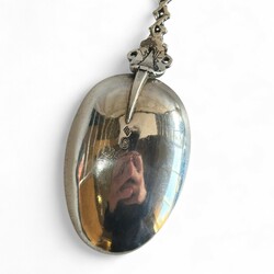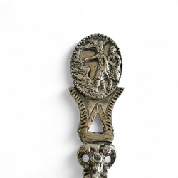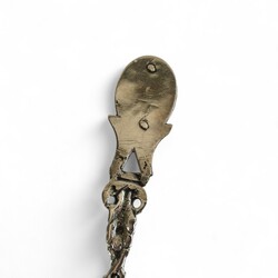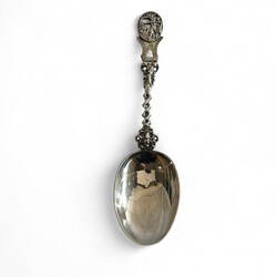 | Omschrijving | Een antieke 19e eeuwse tweede gehalte (835/1000) zilveren geboortelepel, getorste steel, bekroond met een ovaal medaillon, voorstelling van twee figuren. Op de bak met stippelgravure ‘H.A.’, meesterteken HF in ruit = Hendrik Fieringa, werkzaam te Leeuwarden, 1812-1815 en Frans keur, haan. |