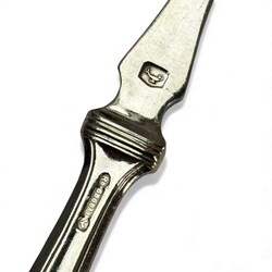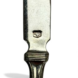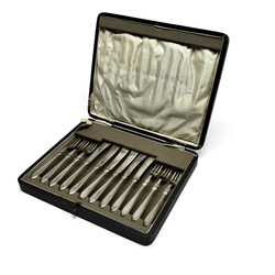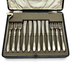 | Omschrijving | Een antiek zesdelig verzilverd visbestek, zes vorken en zes mesjes in cassette. Gemerkt met olielampje, serienummer 686611, en 'RD' = Roberts & Belk, Sheffield, ca. 1900. |