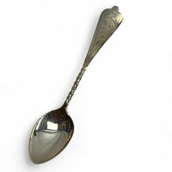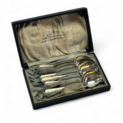 | Omschrijving | Een set van zes vroeg 20e eeuwse tweede gehalte (835/1000) zilveren theelepels, getorste en gegraveerde steel. Aan de achterzijde gemerkt met zwaardje en meesterteken ‘AJD’ in vierkant = fa. A.J. Driessen, werkzaam te Schoonhoven van 1923 tot 1943. In doosje, gemerkt J.F. Rekpo Sneek – Lemmer – Bolsward. |