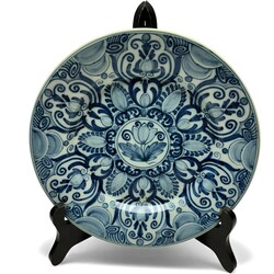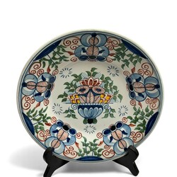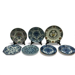 | Omschrijving | Lot van zeven 20e eeuwse aardewerken wandborden, zesmaal Tichelaar en éénmaal Porceleyne Fles. Diverse modellen, o.a. twee blauw-witte pauwenborden, een blauw-wit en en een polychroom bord met bloemenmand. Porceleyne Fles bord met opschrift ‘Easter 1974’. |