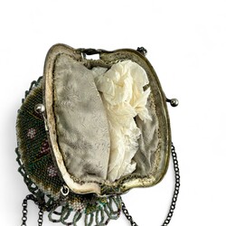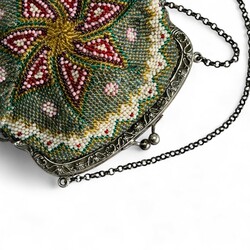 | Omschrijving | Een 20e eeuws derde gehalte (800/1000) zilveren beursbeugel, versierd met decor van schelpen en vissenkoppen, aan een kralentasje en jasseronketting. |