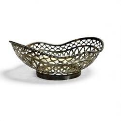| Omschrijving | Een 20e eeuws tweede gehalte (835/1000) zilveren bonbonmandje. Ajour gezaagd, versierd met parelrand aan de bovenzijde. Aan de onderzijde gemerkt ‘JK’, = J. Krins, werkzaam te Schoonhoven van 1947 tot 1977, jaarletter F (1965). |