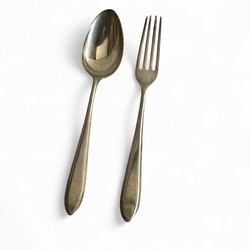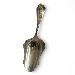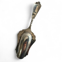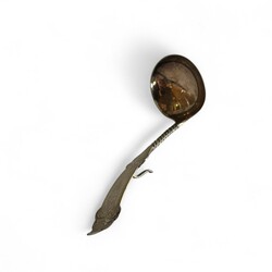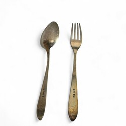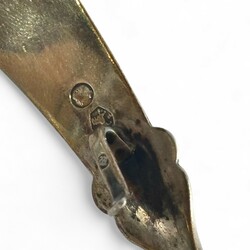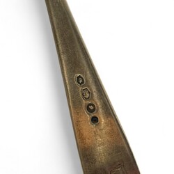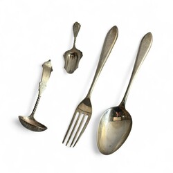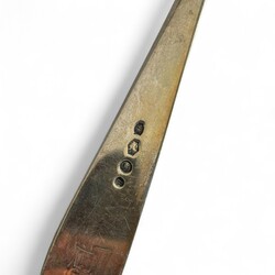 | Omschrijving | Lot divers tweede gehalte (835/1000) Nederlands zilver: een Nederlands couvert, puntfilet, mr. van Kempen, jaarletter D (=1938), gegraveerd met monogram. Met daarbij een suikerschepje, gegraveerd en getorste steel, meesterteken GB21 = Gerrit van den Bergh, Schoonhoven 1876 tot 1921, en roomlepel, getorste en gegraveerde steel, jaarletter 1906. |