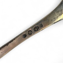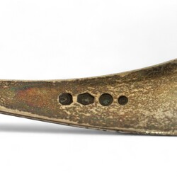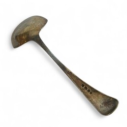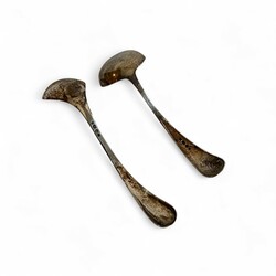 | Omschrijving | Lot van twee tweede gehalte (835/1000) Nederlands zilveren lepels: een juslepel, Haags Lof, gemerkt Voorschoten, jaarletter P (1925), gegraveerd met initialen ‘AJK’ en datering ‘1-12-25’. Met daarbij een eierlepel, jaarletter H (1867), onduidelijk meesterteken (WB?). |