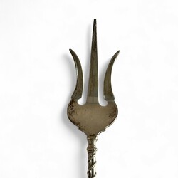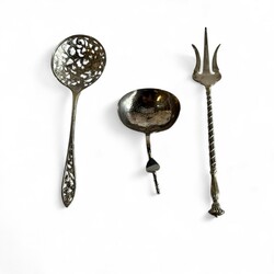 | Conditie | Roomlepel gerepareerd bij aanzet van de steel, cakevork en natfruitschep in goede staat |