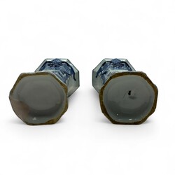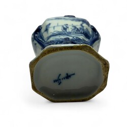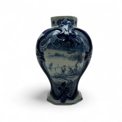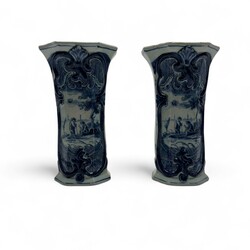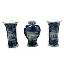 | Omschrijving | Een 18e eeuws driedelig Delfts aardewerken kaststel, 23 cm hoog. 1 dekselvaas en twee bekervazen. Blauw/wit met decor van twee personen aan het water. Deskel- vaas gemerkt JVDuijn (= Johannes van Duijn eigenaar van de Porceleijne Schotel van 1764-1773). Deksel missend en enkele restauraties. |