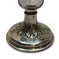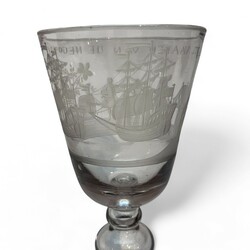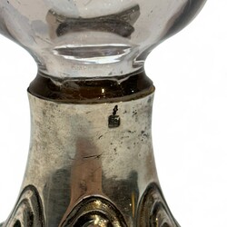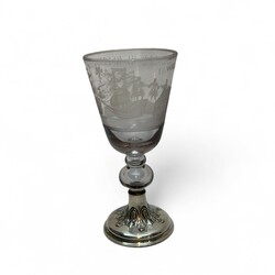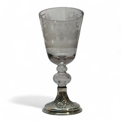 | Omschrijving | 18e eeuwse kristallen bokaal,versierd met graveerwerk en spreuk" T' `Welvaren van de negoty" geplaatst op zilveren voet |