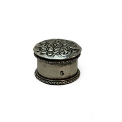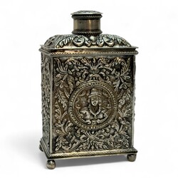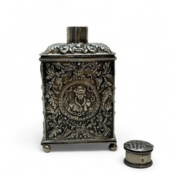 | Omschrijving | 19e zilveren theebus,versierd met drijfwerk en medaillons-uitschuifbare bodem. |