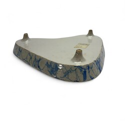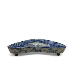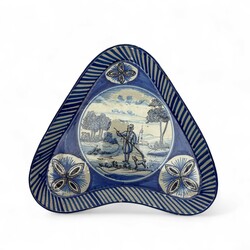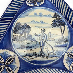 | Omschrijving | Een antieke 19e eeuwse blauw beschilderde aardewerken onderzetter voor kraankan, met voorstelling van jager met geweer en hond in medaillon. Tichelaar Makkum, ca. 1880. Met veilingsticker Bruun Rasmussen, Denemarken. |
