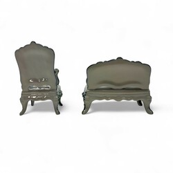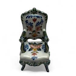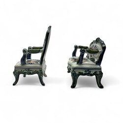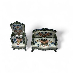 | Omschrijving | Lot van twee 20e eeuwse polychroom beschilderde aardewerken miniatuur meubels, fauteuil en bankje. Beide gemerkt Tichelaar, Makkum. |