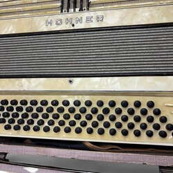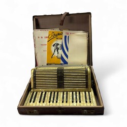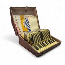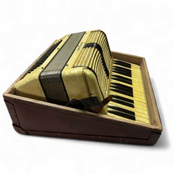 | Omschrijving | Accordeon ‘Hohner’, de kast van geel kunststof met parelmoerachtige gloed, in bijbehorende kist, met kleine collectie bladmuziek |