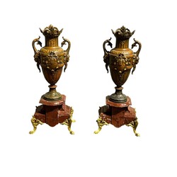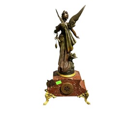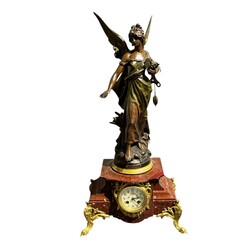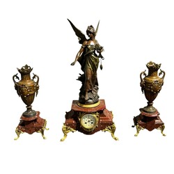 | Omschrijving | Driedelig metalen pendulestel met vergulde details en rood marmer, bestaande uit: pendule bekroond door een gevleugelde vrouw met in haar handen een zak met muntstukken, daarbij een paar oorvazen, het geheel classistisch vormgegeven, eind 19e/begin 20e eeuw |