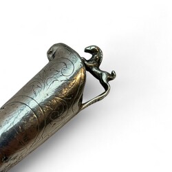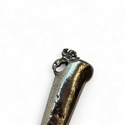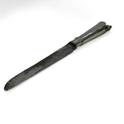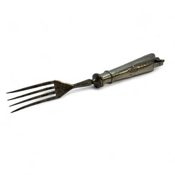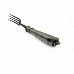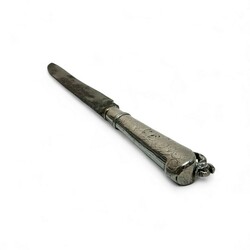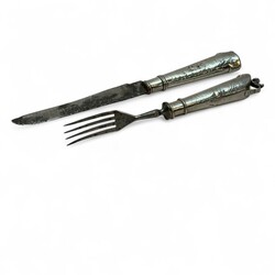 | Omschrijving | Antiek reisbestek , bestaande uit mes en vork, beide versierd met een zilveren heft |