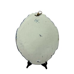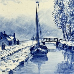 | Omschrijving | Een antieke blauw-wit beschilderde Tichelaar plaquette, ca. 1900. Gecontourneerde, gemarmerde rand met centraal een wintergezicht met boerderij en zeilpraam bij bruggetje. Aan de achterzijde gemerkt met gekruiste T's. |