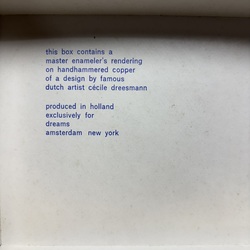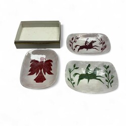 | Omschrijving | Lot van twee geëmailleerde schaaltjes, twee met voorstelling van ruiter te paard en één met vogel. Uitgevoerd door Cecile Dreesmann voor Dreams Amsterdam-New York |