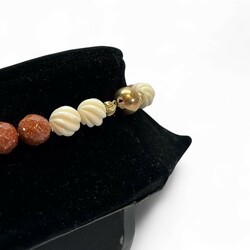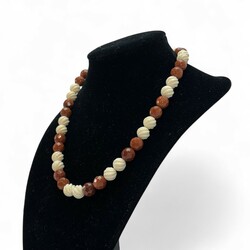 | Omschrijving | Collier van afwisselend twee benen en twee goudstenen kralen, met 14 karaats gouden bolslot |