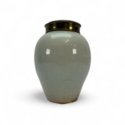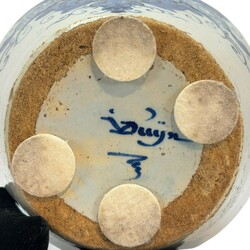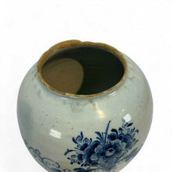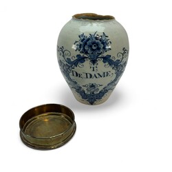 | Omschrijving | Delfts aardewerk tabakspot met blauw-wit decor, cartouche met florale motieven met daarin de tekst: 'T',, De, Dame', gemonogrammeerd Johannes van Duijn, eigenaar van/gemaakt voor De Porceleyne Schotel, tweede helft 18e eeuw -met messing deksel van latere datum- |