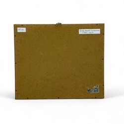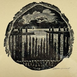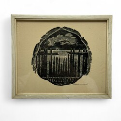 | Omschrijving | Hout/linosnede op papier, 13 x 13 cm. Doorkijkje naar de haven in avondlicht met wolken en schepen. Gesigneerd Dirk Kerst Koopmans (1906-1998). |