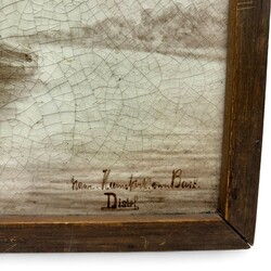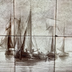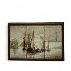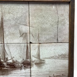 | Omschrijving | Een antiek zespas keramieken tegeltableau, met sepia beschildering van zeilschepen op het water. Gemerkt Distel |