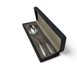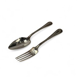 | Conditie | Vork van dinercouvert gerestaureerd, steel van roomlepel uiteinde ietwat verbogen |