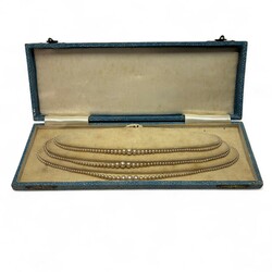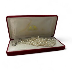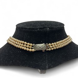 | Omschrijving | Drie parelcolliers: één driestrengs parelcollier met eerste gehalte zilveren sluiting, gemerkt Engeland, in originele doos, één parelcollier met tweede gehalte zilveren sluiting, en één lang collier met faux parels en tweede gehalte zilveren sluiting gedecoreerd met een pareltje en met extra veiligheidskettinkje |