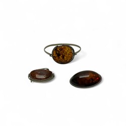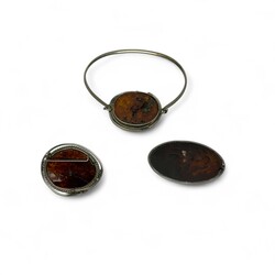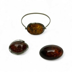 | Omschrijving | Lot van drie sieraden in zilveren monturen, een broche en armband met barnsteen en een hanger met kunststof steen. |
