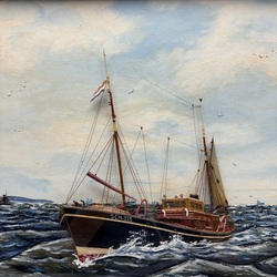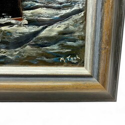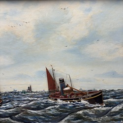 | Omschrijving | Driedimensionaal zeegezicht met het schip ‘Scheveningen 225’, gemengde techniek op paneel, waaronder koperdraad en olieverf, gesigneerd rechtsonder M. Taal |