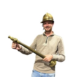 | Omschrijving | Duitse messing brandweerhelm, binnenzijde gemerkt C.D. Magirus, ULM a. D., en messing brandweerspuit, begin 20e eeuw, |