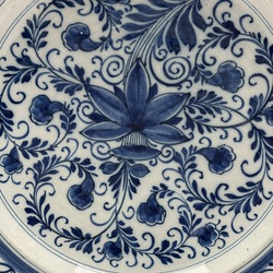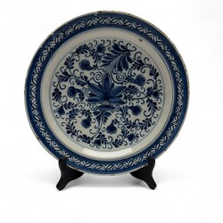| Omschrijving | Een 18e eeuwse English Delftware aardewerken schotel, 30 cm doorsnede. Blauw/ wit Chinoiserie decor van lotus met gekrulde bladeren op het plat. Ca 1760. Gaaf. |