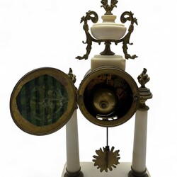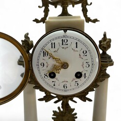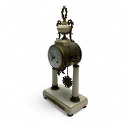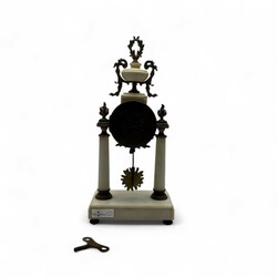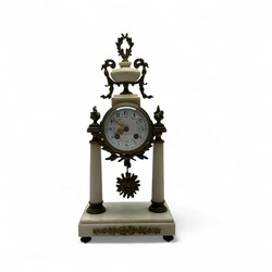 | Omschrijving | Een 19e eeuws wit marmeren pilaarklok met bronzen apllicaties. Voorzien van een witte emaille wijzerplaat met florale motieven. Met zonneslinger en sleutel. |