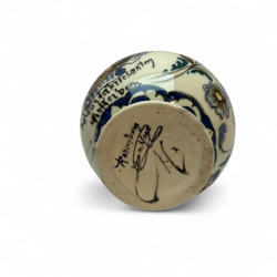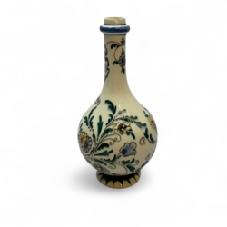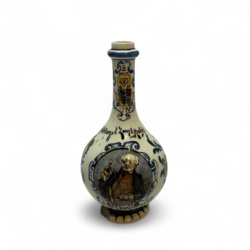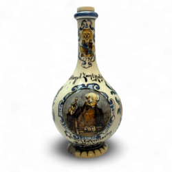 | Omschrijving | Een antieke platelen likeurkruik, 24 cm hoog. Voor de firma Hulskamp & Zn, Rotterdam. Polychroom beschilderd met het logo van Hulskamp en rest floraal. Uitvoering plateel- fabriek Rozenburg, Den Haag met jaarletter H voor 1892. Chip aan de voet en kleine chip op de hals. |