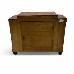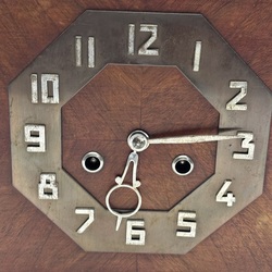 | Omschrijving | Een art deco tafelklok, 30 x 14 x 24 cm. In een noten met eikenhouten kast en verchroomdecijfers. Ca 1930. Werking niet getest, wel compleet met sleutel. |