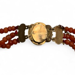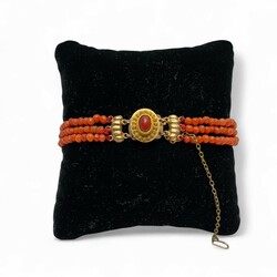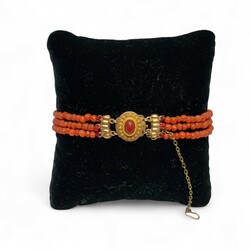 | Omschrijving | Een drierijig bloedkoralen armband aan een 14 krt (585/1000) gouden slot met een cabuchon geslepen bloedkoraal. |