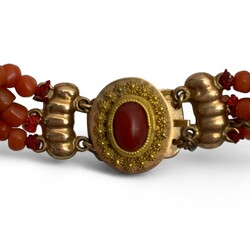 | Kavel | 1834. Een drierijig bloedkoralen armband aan een 14 krt gouden slot met bloedkoraal. |