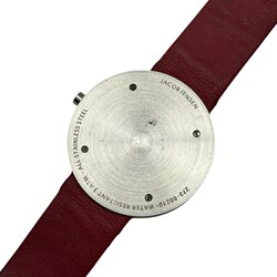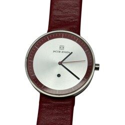 | Omschrijving | Een edelstalen Jacob Jensen 270 strata polshorloge met datum op zes uur. Met rode lederen band. |