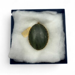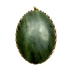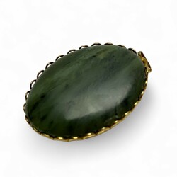 | Omschrijving | Een vergulde hanger met cabuchon geslepen jadeiet. In doos. |