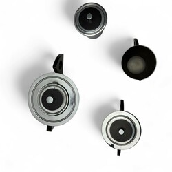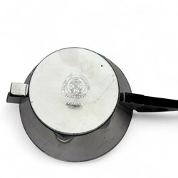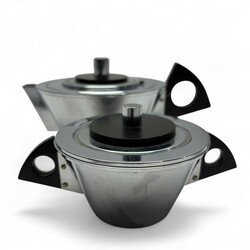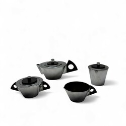 | Omschrijving | Een vierdelige art deco verchroomd theeservies met gestilleerd houten handgrepen, 10 cm hoog. Bestaande uit een theepot, roomstel en theebus. Ontwerp van Meine Huisenga (1876-1964) voor Daalderop, Tiel ca 1930. |