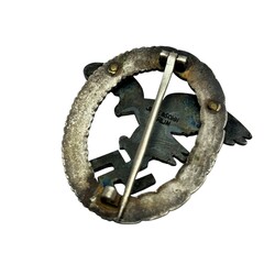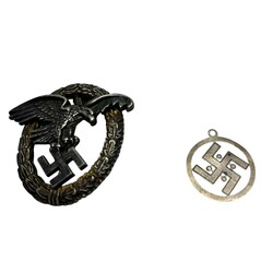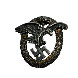 | Omschrijving | Een WWII "Luftwaffe Observers speld" Vliegende adelaar in lauwerkrans. Gemerkt door de maker: Jmme and Sohn, Berlin. Hierbij een hanger. |