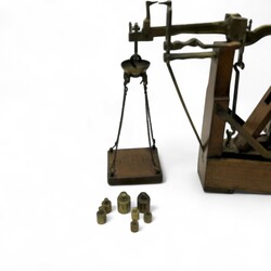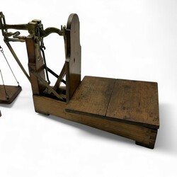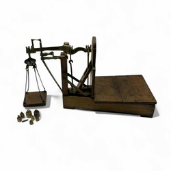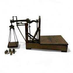 | Omschrijving | Een antieke 19e eeuwse eikenhouten en messing bascule, met daarbij een set geijkte gewichtjes |