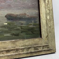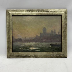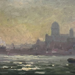 | Omschrijving | Schilderij, olieverf op paneel. Stadsgezicht vanaf het water, met op de achtergrond mogelijk de Sint Nicolaaskerk te Amsterdam. Onduidelijk gesigneerd, Europese School 20e eeuw. |