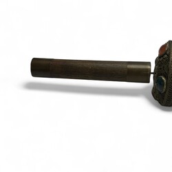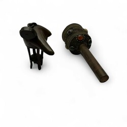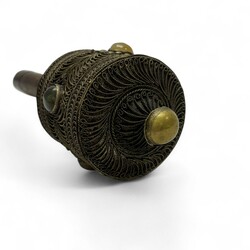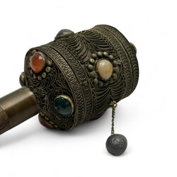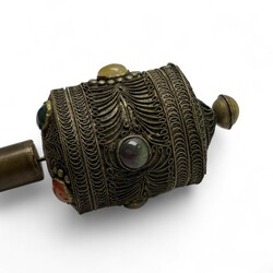 | Omschrijving | Lot divers: een 20e eeuwse veerzilverde en filigrain bewerkte Tibetaanse gebedsmolen, ingelegd met halfedelstenen. Met daarbij een bronzen hangend olielampje, vermoedelijk Duits 18e of 19e eeuws. |