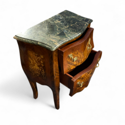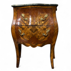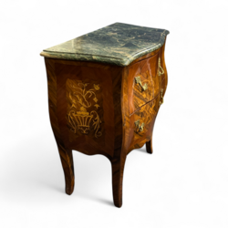 | Omschrijving | Gebombeerde commode met intarsia in de vorm van florale motieven, het blad van groen natuursteen, het beslag van goudgelakt metaal, Louis Seize-stijl, 20e eeuw |
